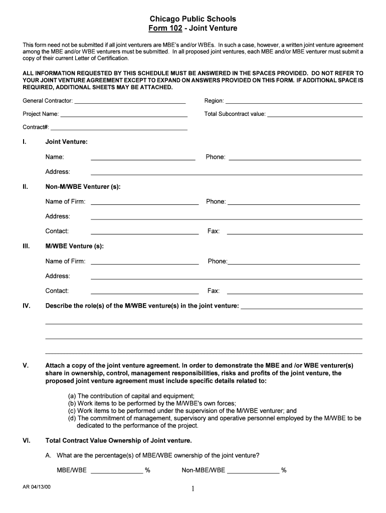Chicago Public Schools Form 102 Joint Venture This form need not be submitted if all joint ventures are MBS and/or Woes. In such a case, however, a written joint venture agreement among the BE and/or