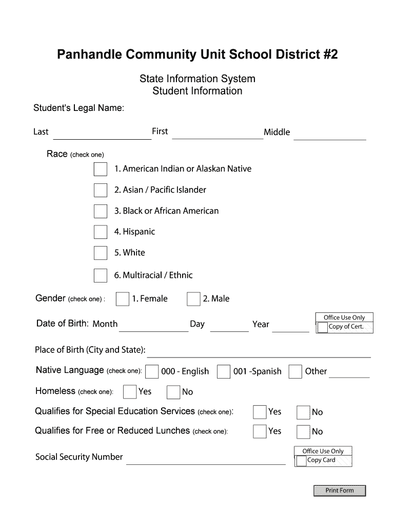 The Student Information Form is a school enrollment document used by Panhandle Community Unit School District #2 to collect demographic and educational data about students.