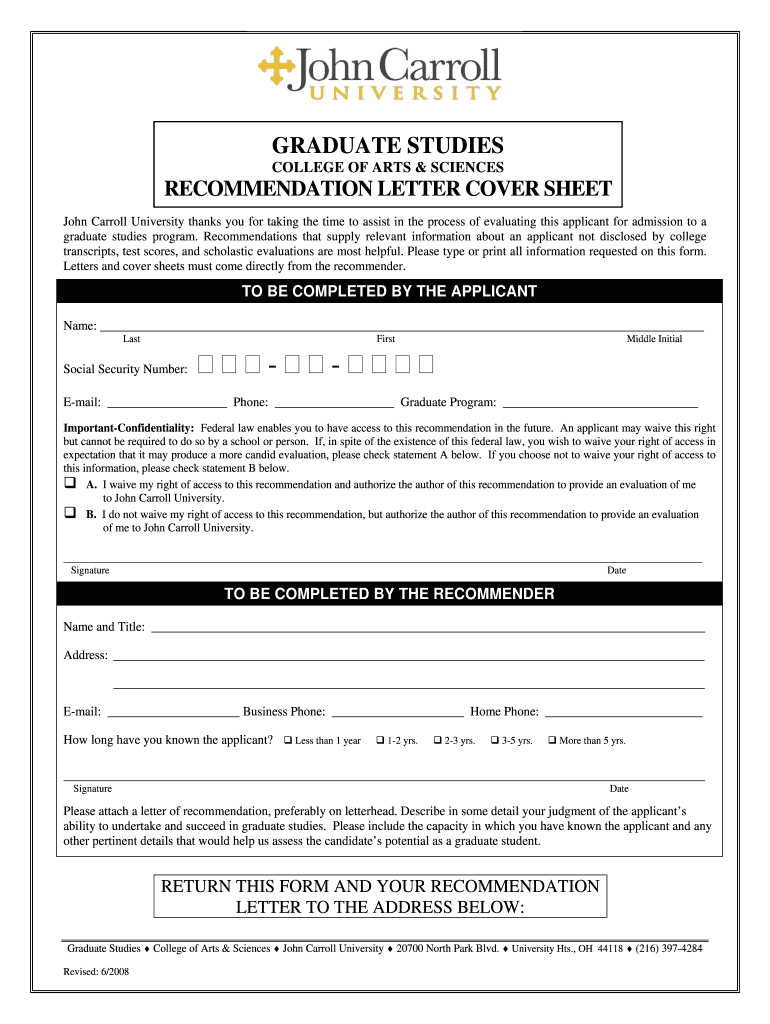 The Graduate Studies Recommendation Letter Cover Sheet is a formal document used by John Carroll University to collect recommendation letters from endorsers for graduate program applicants.