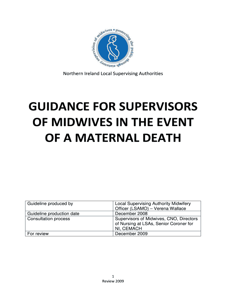 Northern Ireland Local Supervising Authorities GUIDANCE FOR SUPERVISORS OF MIDWIVES IN THE EVENT OF A MATERNAL DEATH Guideline produced by Guideline production date Consultation process For review