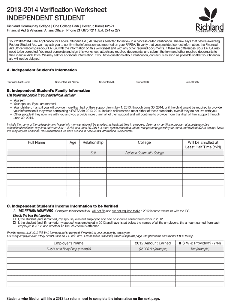 The 2013-2014 Verification Worksheet is a financial aid document used by Richland Community College to verify FAFSA information from independent students.