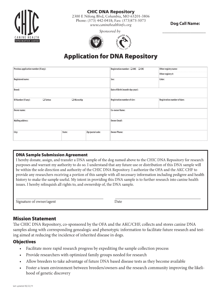 CHIC DNA Repository2300 E Nixon Blvd, Columbia, MO 652013806 Phone: (573) 4420418; Fax: (573)8755073 www.caninehealthinfo.orgDog Call Name:Sponsored by C A N I N E H E A LT Application for DNA Repository