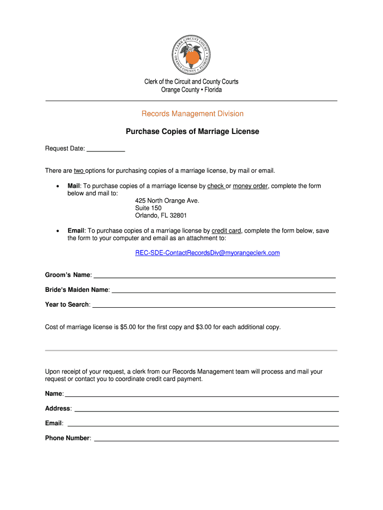The Marriage License Copy Request Form is a government document used by individuals to request copies of marriage licenses in Orange County, Florida.