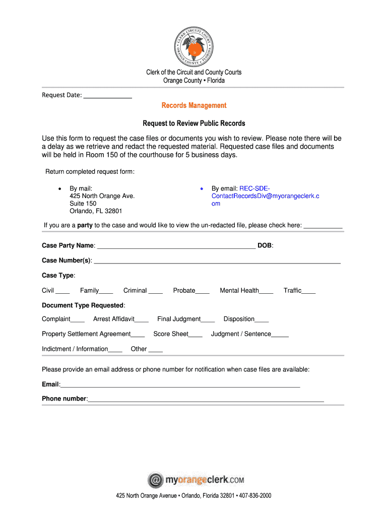 Any individual or entity wishing to access public records from the Orange County Circuit and County Courts is eligible to use this form, including residents, researchers, attorneys, and members of the media.