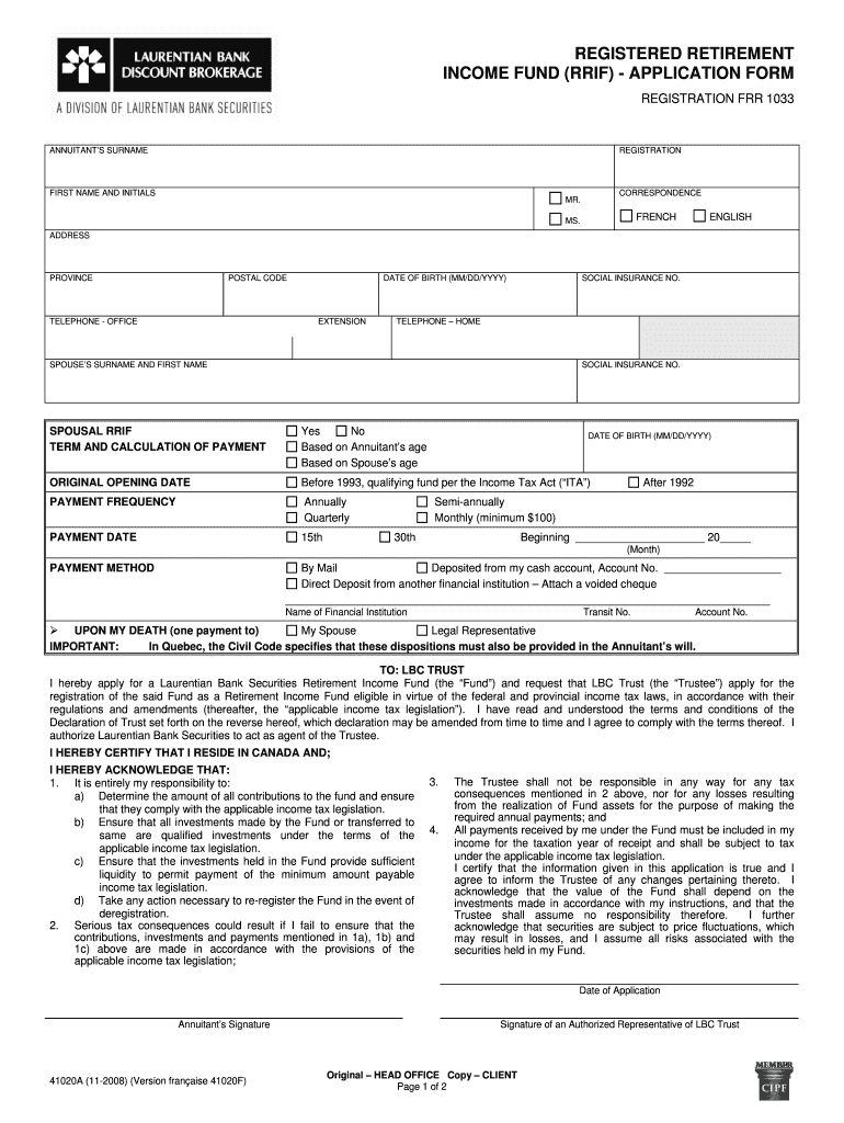 REGISTERED RETIREMENT INCOME FUND (RIF) APPLICATION FORM REGISTRATION FRR 1033 ANNUITANT S SURNAME REGISTRATION FIRST NAME AND INITIALS CORRESPONDENCE MR. FRENCH MS. ENGLISH ADDRESS PROVINCE POSTAL