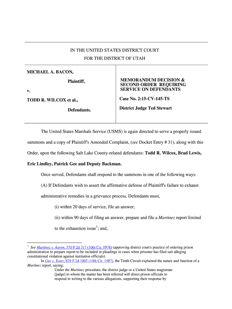 IN THE UNITED STATES DISTRICT COURT FOR THE DISTRICT OF UTAH MICHAEL A. BACON, v.MEMORANDUM DECISION & SECOND ORDER REQUIRING SERVICE ON DEFENDANTSTODD R. WILCOX et al., Case No. 2:15CV145TSPlaintiff,Defendants.