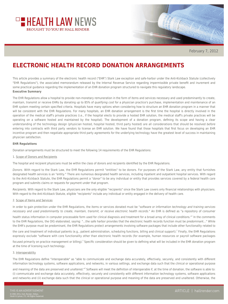 February 7, 2012ELECTRONIC HEALTH RECORD DONATION ARRANGEMENTS This article provides a summary of the electronic health record (“EHR “) Stark Law exception and safe harbor under the AntiKickback