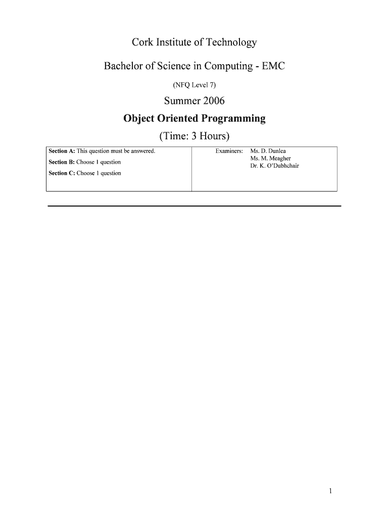Cork Institute of Technology Bachelor of Science in Computing EMC (NFL Level 7) Summer 2006 Object-Oriented Programming (Time: 3 Hours) Section A: This question must be answered. Section B: Choose