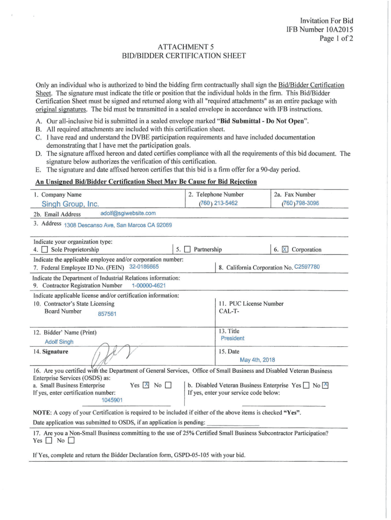 Invitation For Bid IF N umber IOA2015 Page I of2 ATTACHMENT 5 BID/BIDDER CERTIFICATION Shelton an individual who is authorized to bind the bidding firm contractually shall sign the Bid/Bidder Certification