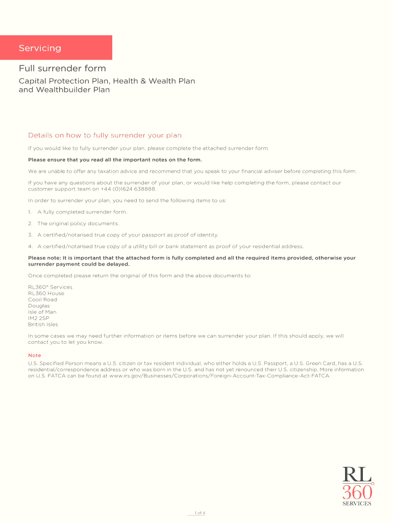 Servicing Full surrender form Capital Protection Plan, Health & Wealth Plan and Wealth builder Plantains on how to fully surrender your plan If you would like to fully surrender your plan, please