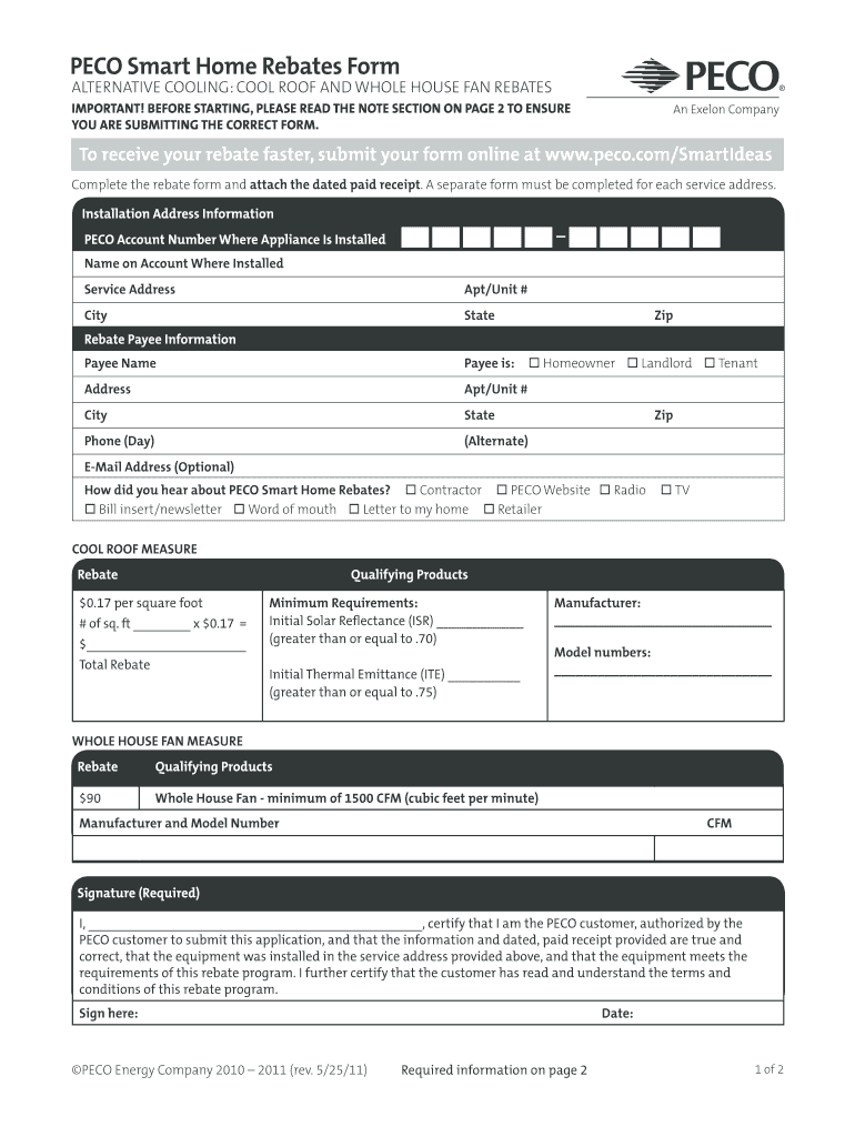 Eligibility for the PECO Smart Home Rebates requires that you are a PECO customer in Pennsylvania who installed qualified cooling equipment such as cool roofs or whole house fans.