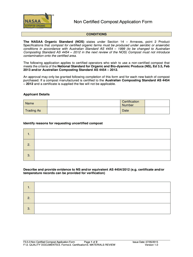 Non Certified Compost Application Form CONDITIONS The NASA Organic Standard (NOS) states under Section 14 Annexes, point 2 Product Specifications that compost for certified organic farms must be produced