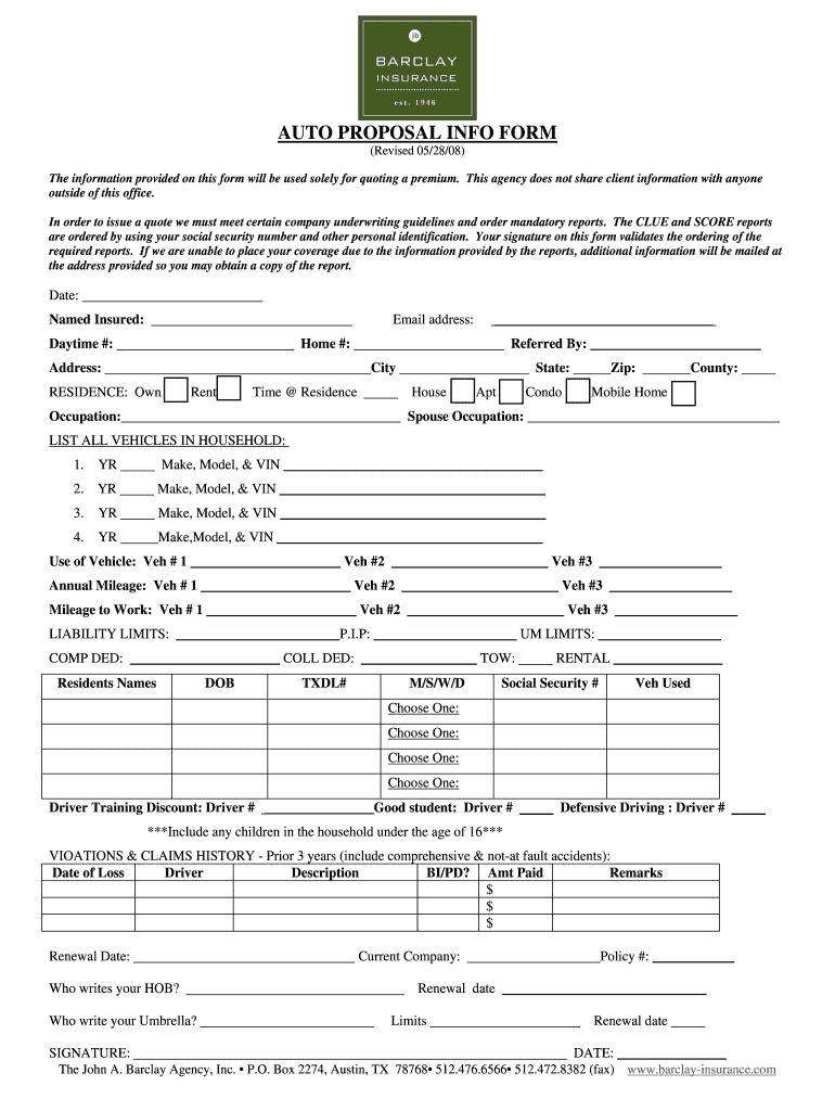 Get the free Auto Insurance Proposal Form