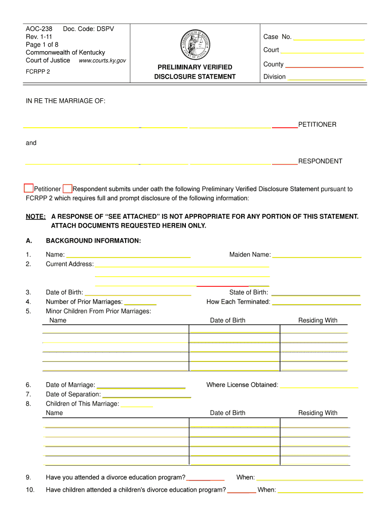 The Kentucky Preliminary Verified Disclosure Statement does not require notarizing, but it's always good to check specific court requirements for your case.