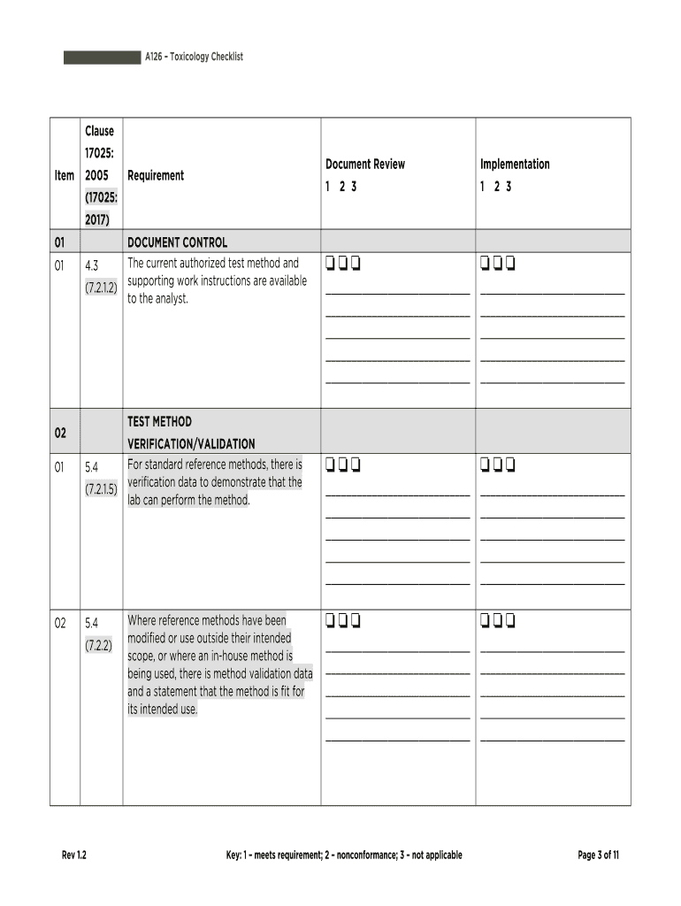 The A126 Toxicology Checklist Form is intended for laboratories and professionals involved in toxicology testing who need to demonstrate compliance with ISO/IEC 17025:2017 standards.