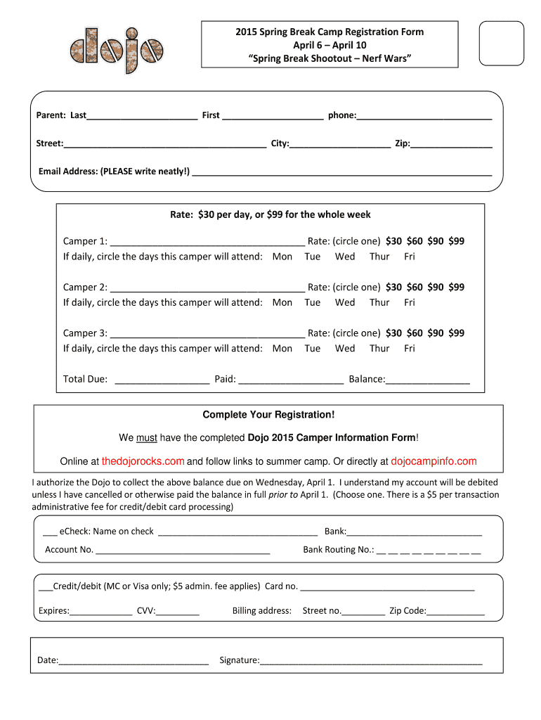 2015 Spring Break Camp Registration Form April 6 April 10 Spring Break Shootout Nerf Warpaint: Last First phone: Street: City: Zip: Email Address: (PLEASE write neatly!) Rate: $30 per day, or $99