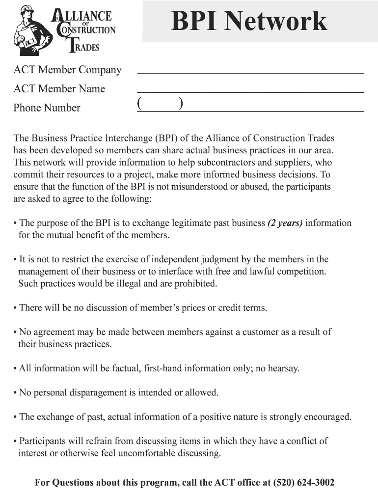 BPI Network ACT Member Company ACT Member Name Phone Number()The Business Practice Interchange (BPI) of the Alliance of Construction Trades has been developed, so members can share actual business