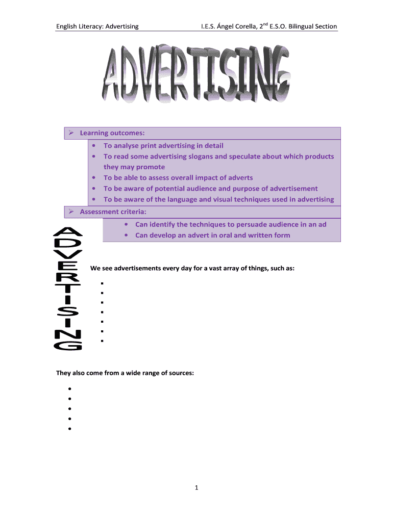 I.E.S. Angel Corolla, 2nd E.S.O. Bilingual Section English Literacy: Advertising Learning outcomes: To analyze print advertising in detail To read some advertising slogans and speculate about which