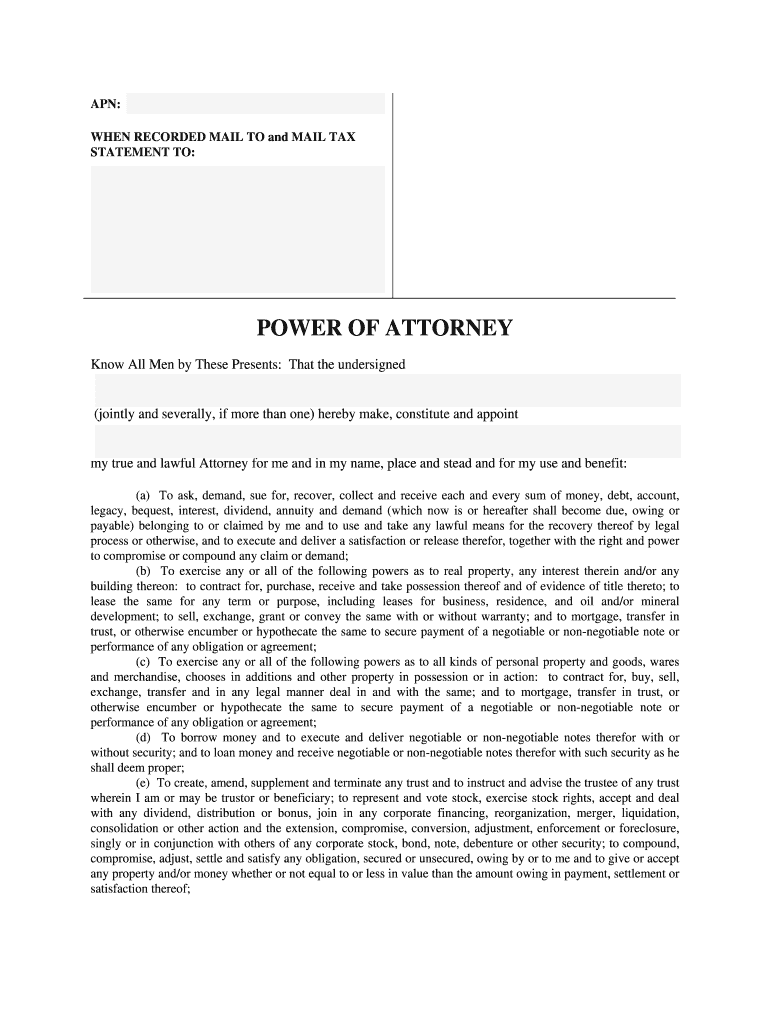 Blank fields are provided for inserting attorney-in-fact information and descriptions of granted powers.