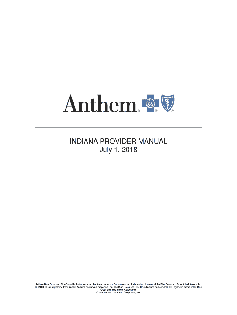 INDIANA PROVIDER MANUAL July 1, 20181 Anthem Blue Cross and Blue Shield is the trade name of Anthem Insurance Companies, Inc. Independent licensee of the Blue Cross and Blue Shield Association. ANTHEM