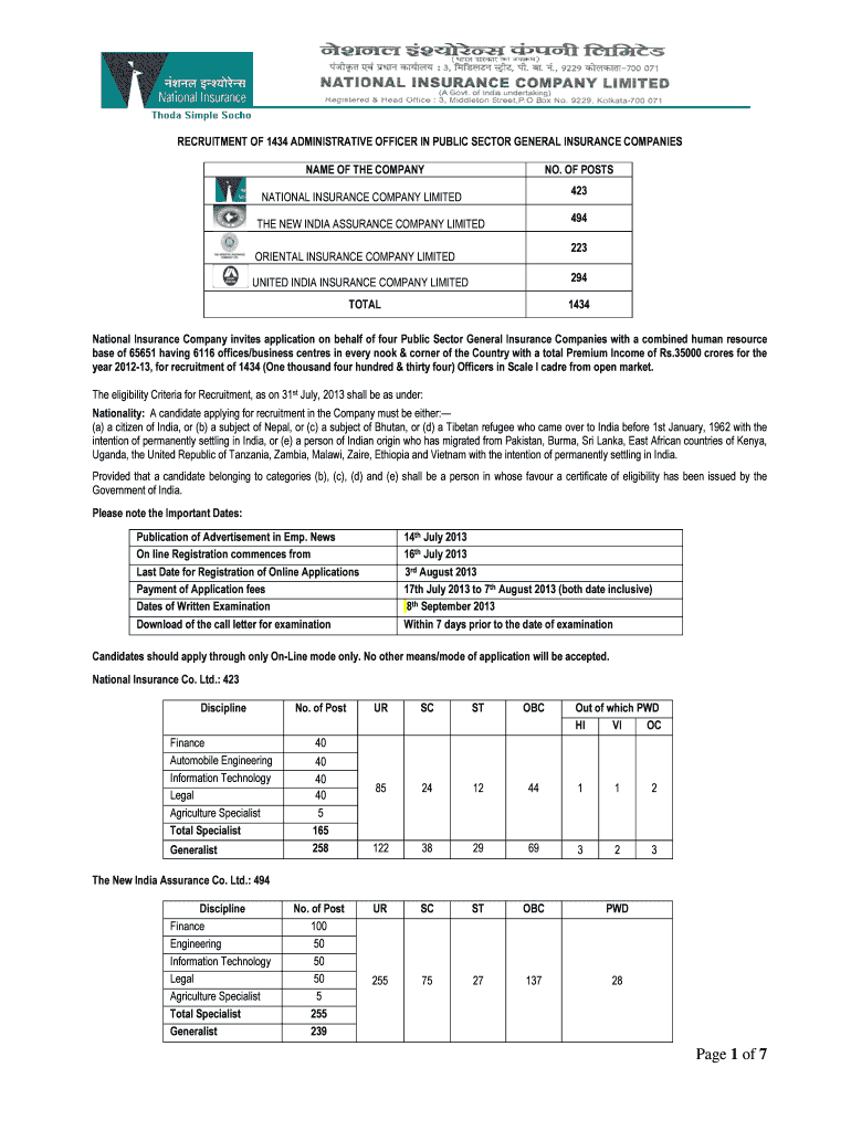 RECRUITMENT OF 1434 ADMINISTRATIVE OFFICER IN PUBLIC SECTOR GENERAL INSURANCE COMPANIES NAME OF THE COMPANY NO. OF POSTS 423 NATIONAL INSURANCE COMPANY LIMITED 494 THE NEW INDIA ASSURANCE COMPANY
