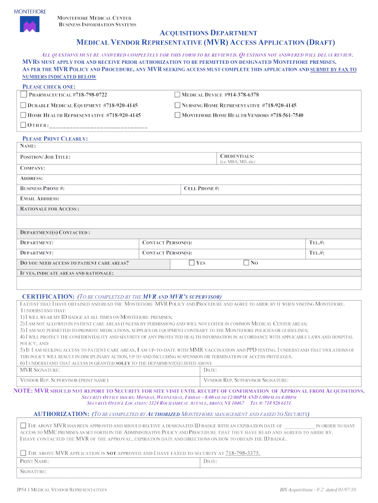 Get the free Montefiore Medical Vendor Access Application