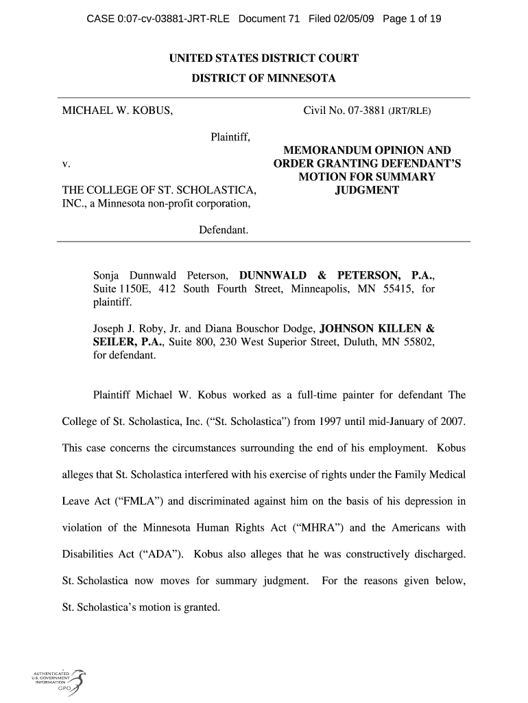CASE 0:07cv03881JRTRLE Document 71 Filed 02/05/09-Page 1 of 19UNITED STATES DISTRICT COURT DISTRICT OF MINNESOTA MICHAEL W. KOB US, Civil No. 073881 (ART/RLE) Plaintiff, v. THE COLLEGE OF ST. SCHOLASTIC,