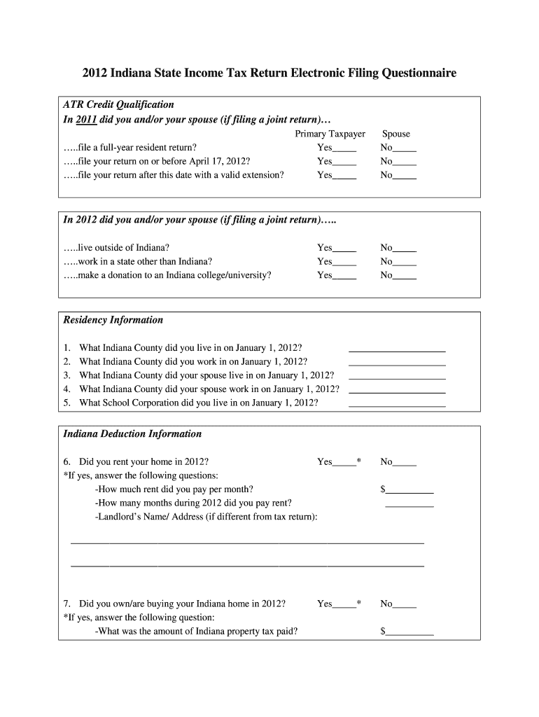 To use the 2012 Indiana State Income Tax Return Questionnaire, you must be an Indiana resident filing for the tax year 2012 and seeking potential deductions or credits.