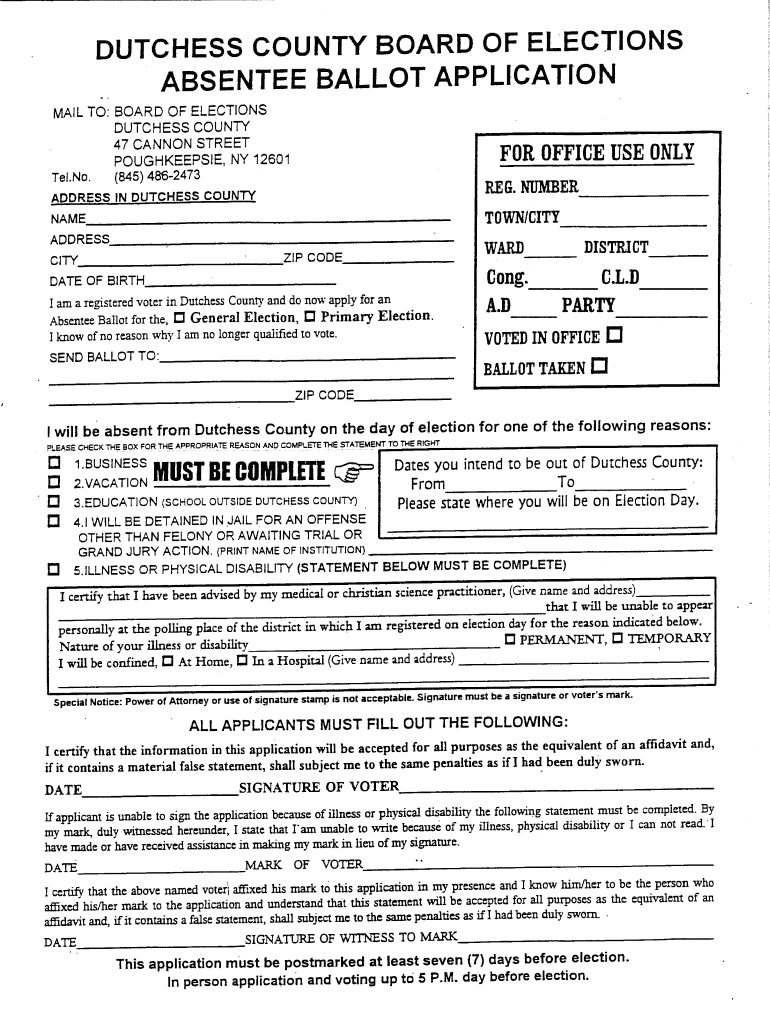 To be eligible, you must be a registered voter in Dutchess County, New York. Additionally, if you are unable to vote in person due to illness or disability, you can also complete this application.