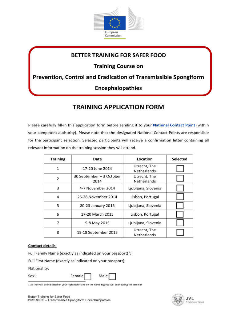 BETTER TRAINING FOR SAFER FOOD Training Course on Prevention, Control and Eradication of Transmissible Spongiform Encephalopathies TRAINING APPLICATION FORM Please carefully fill-in this application