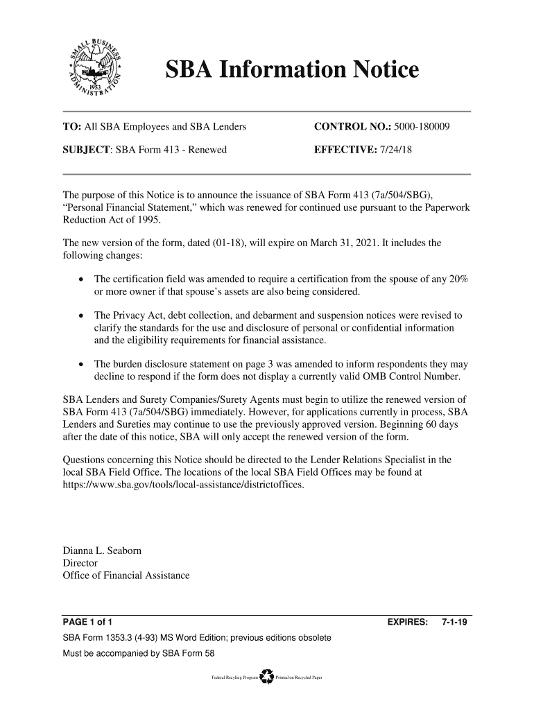SBA Information Notice TO: All SBA Employees and SBA LendersCONTROL NO.: 5000180009SUBJECT: SBA Form 413 RenewedEFFECTIVE: 7/24/18The purpose of this Notice is to announce the issuance of SBA Form
