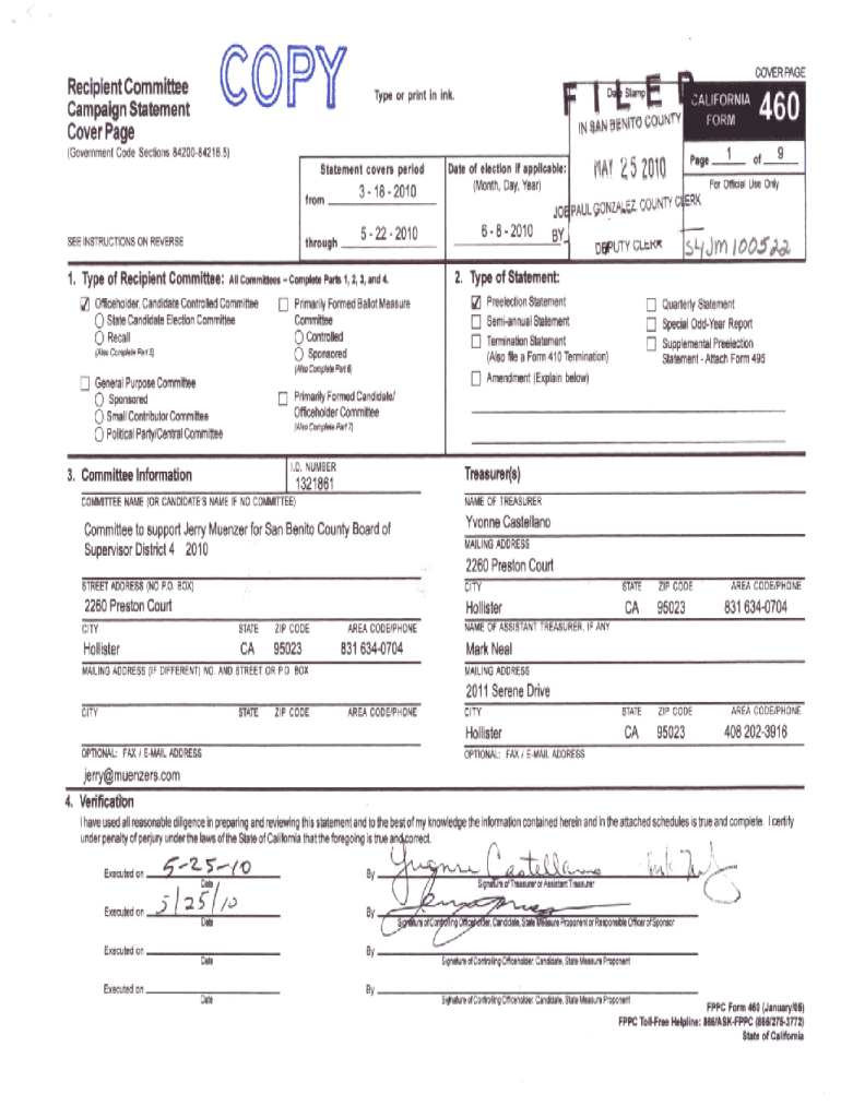 The California FPPC Form 460 is a government document used by recipient committees to report campaign finance activities in California.