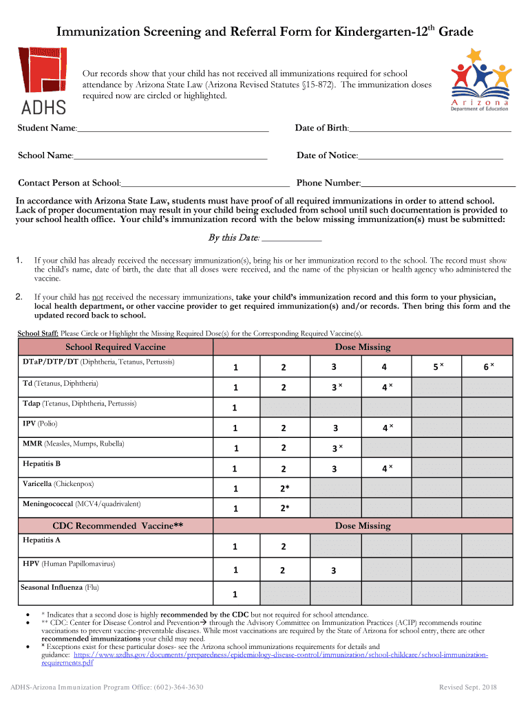 Immunization Screening and Referral Form for Kindergarten12th Grade Our records show that your child has not received all immunizations required for school attendance by Arizona State Law (Arizona