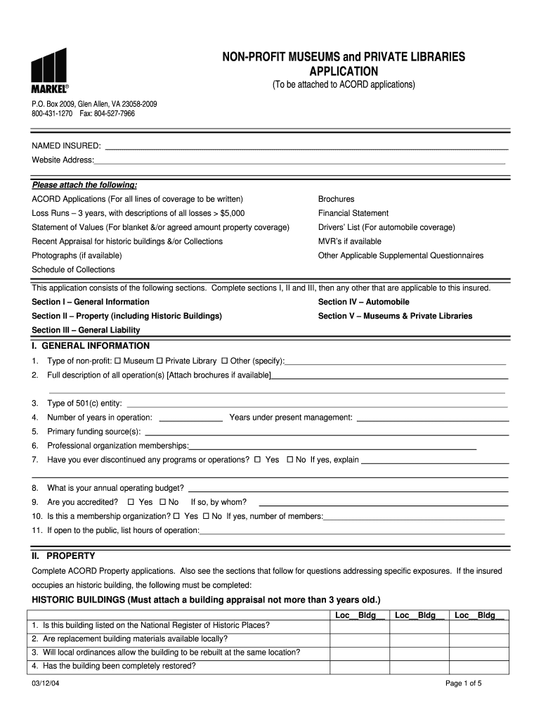 NON-PROFIT MUSEUMS and PRIVATE LIBRARIES APPLICATION (To be attached to applications) P.O. Box 2009, Glen Allen, VA 23058-2009 800-431-1270 Fax: 804-527-7966 NAMED INSURED: Website Address: Please
