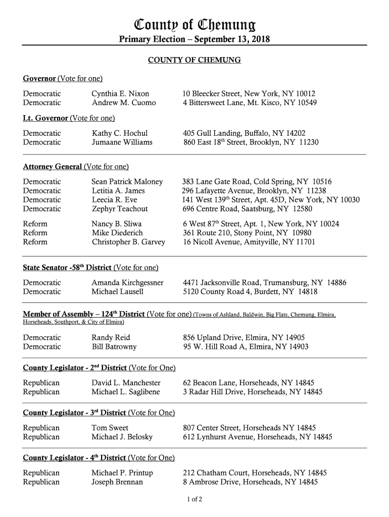County of Che mung Primary Election September 13, 2018, COUNTY OF CHEUNG Governor (Vote for one) Democratic Cynthia E. Nixon Andrew M. Cuomo10 Becker Street, New York, NY 10012 4 Bittersweet Lane,