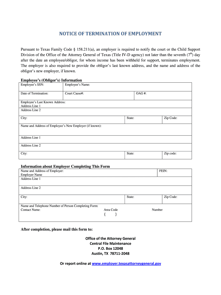 NOTICE OF TERMINATION OF EMPLOYMENT Pursuant to Texas Family Code 158.211(a), an employer is required to notify the court or the Child Support Division of the Office of the Attorney General of Texas