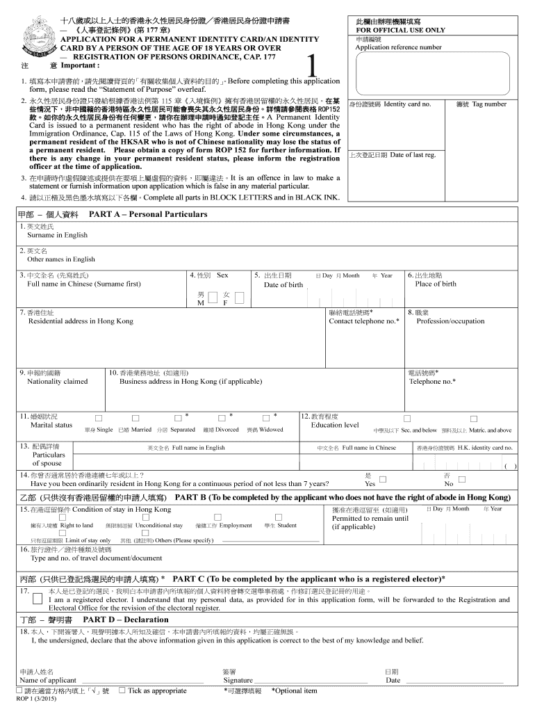 Example of a Completed Hong Kong Permanent Identity Card Application