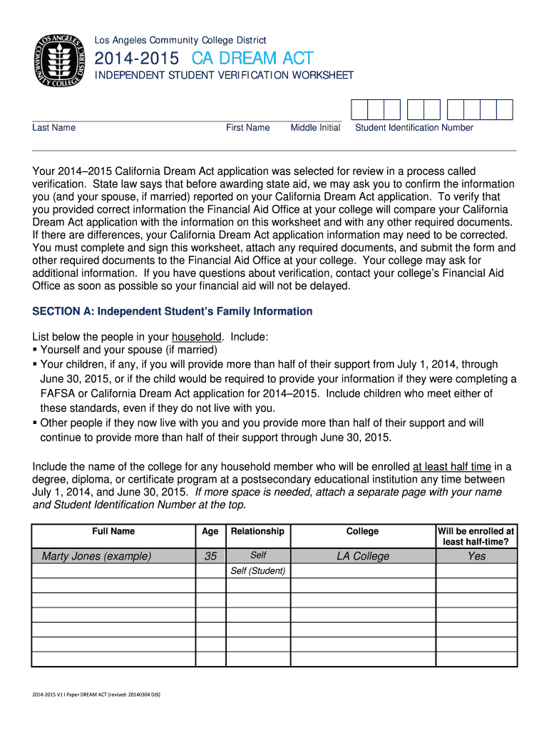Get the free California Dream Act Verification Worksheet