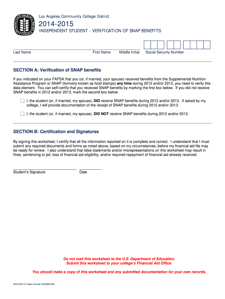 The Independent Student SNAP Benefits Verification is a financial aid application form used by students to verify their receipt of SNAP benefits for the academic year 2014-2015.