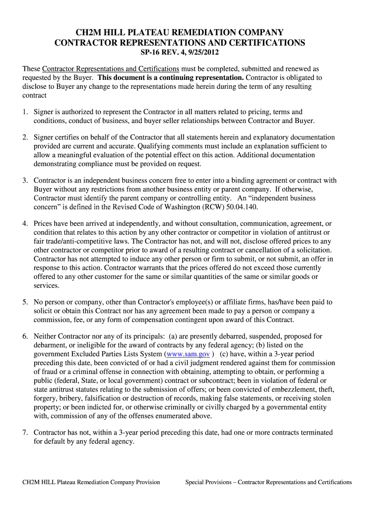 Get the free SP-16, Representations and Certifications - CH2M Hill Plateau ...