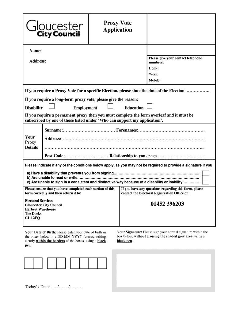 The Proxy Vote Application is a form used by residents in the United Kingdom to request a proxy vote, allowing another person to vote on their behalf.
