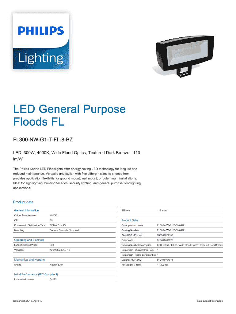 Get the free FL300-NW-G1-T-FL-8-BZLED General Purpose Floods FLPhilips . Product Leaflet - FL300-...