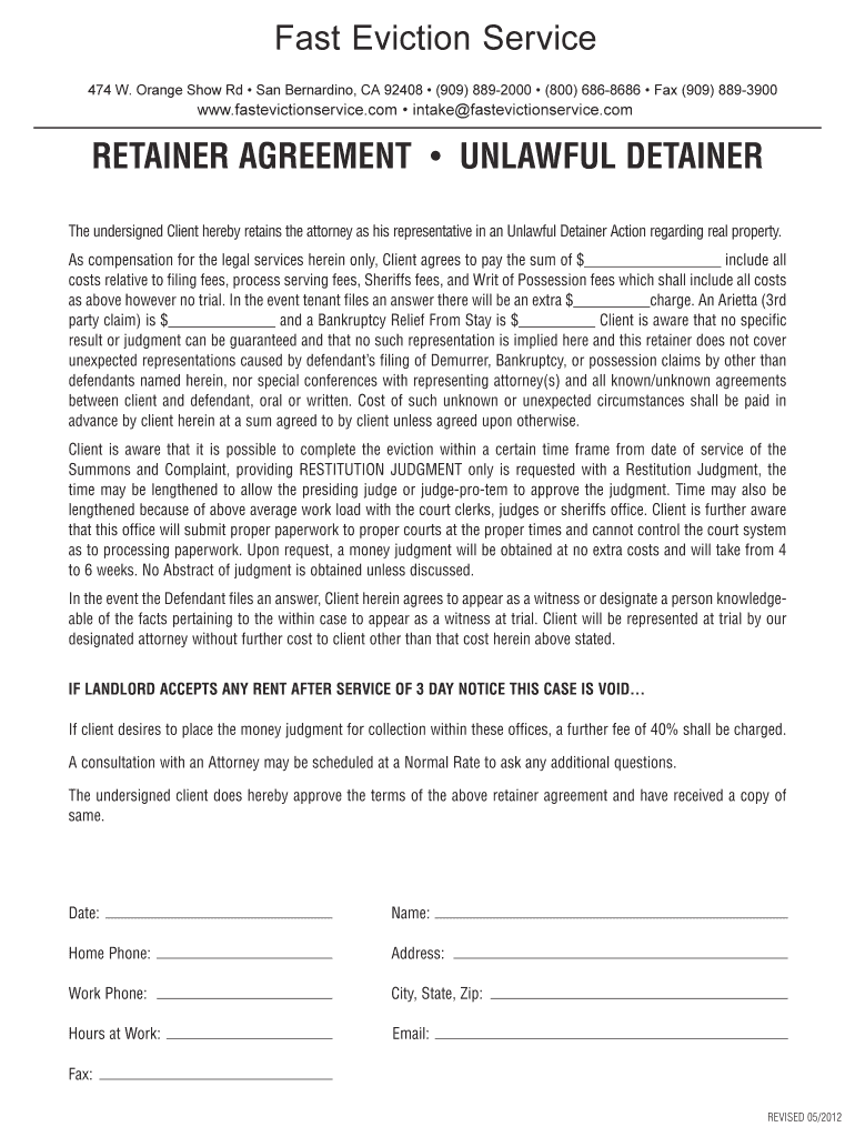 Fast Eviction Service 474 W. Orange Show Rd San Bernardino, CA 92408 (909) 8892000 (800) 6868686 Fax (909) 8893900www.fastevictionservice.com intake fastevictionservice. Container AGREEMENTUNLAWFUL