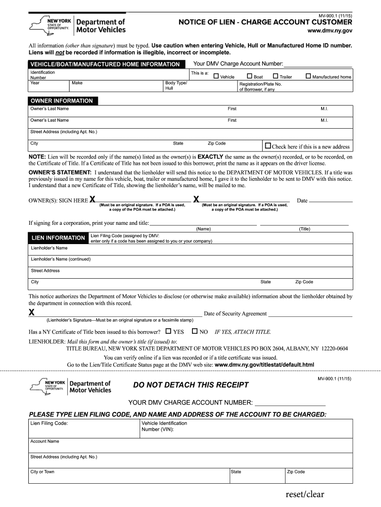 MV900.1 (11/15)NOTICE OF LIEN CHARGE ACCOUNT CUSTOMER www.dmv.ny.gov All information (other than signature) must be typed. Use caution when entering Vehicle, Hull or Manufactured Home ID number. Liens