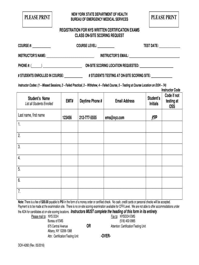 PLEASE Print YORK STATE DEPARTMENT OF HEALTH BUREAU OF EMERGENCY MEDICAL SERVICESPLEASE PREREGISTRATION FOR NYS WRITTEN CERTIFICATION EXAMS CLASS ONSITE SCORING REQUEST COURSE #: COURSE LEVEL: INSTRUCTORS
