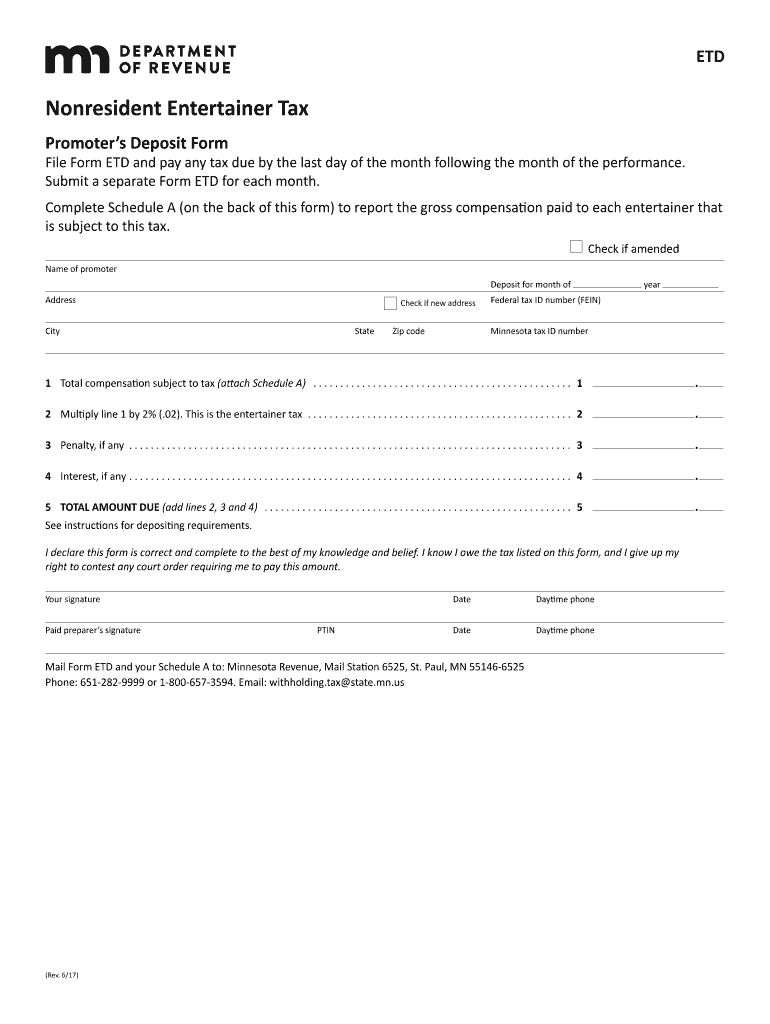 Promoters Deposit Formerly Form ETD and pay any tax due by the last day of the month following the month of the performance.