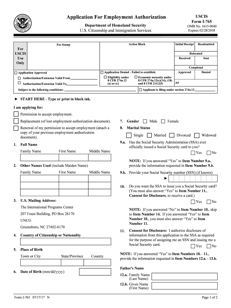 Application For Employment AuthorizationUSCIS Form I765Department of Homeland Security U.S. Citizenship and Immigration Services OMB No. 16150040 Expires 02/28/2018Action Blockade StampInitial Receptor