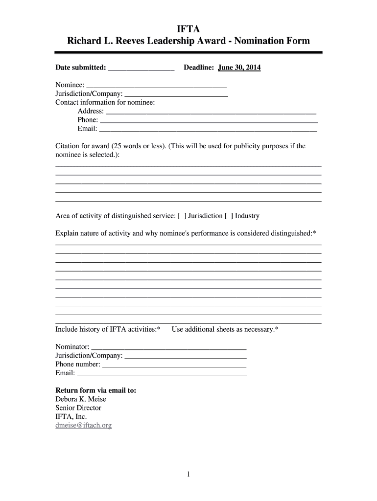 IFTA Richard L. Reeves Leadership Award Nomination Form Date submitted: Deadline: June 30, 2014, Nominee: Jurisdiction/Company: Contact information for nominee: Address: Phone: Email: Citation for