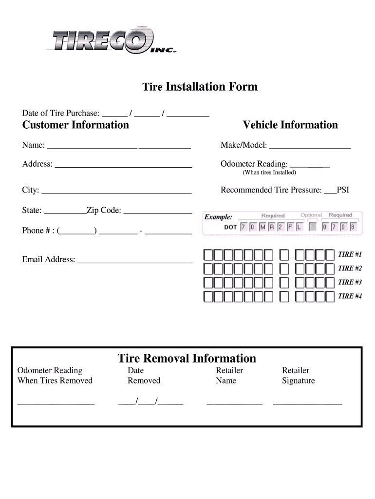 The tire installation form tire must include details such as the customer's information, vehicle make and model, tire brand and size, date of installation, and installer's signature.