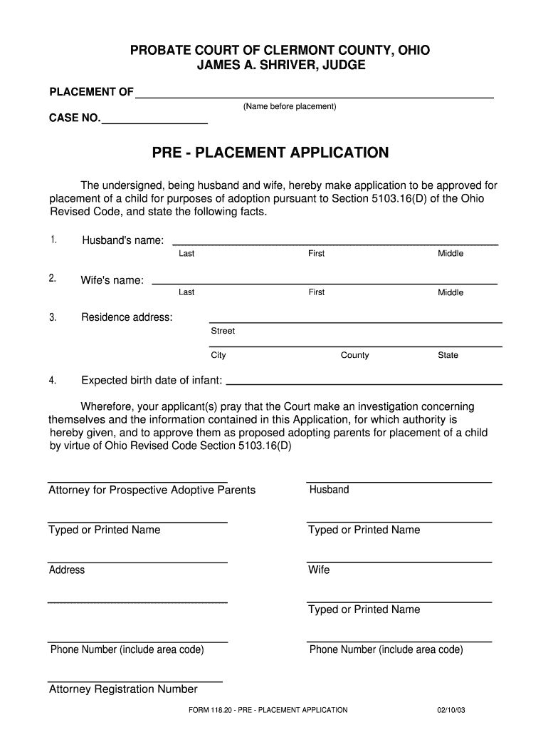 PROBATE COURT OF CLERMONT COUNTY, OHIO JAMES A. SHIVER, JUDGE PLACEMENT OF (Name before placement) CASE NO. PRE PLACEMENT APPLICATION The undersigned, being husband and wife, hereby make application